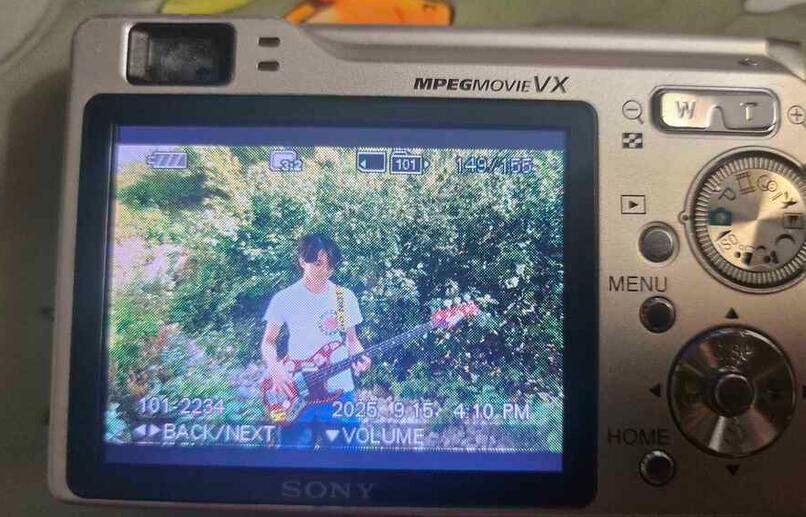 September 15th 8:02pmHad fun during band practice, the sandbox studio's were closed cause of the strikes going on at the college, which sucks balls. i guess no more sound treated room where i can scream my balls off(not that i ever would, but the option is nice to have) Me and the singer r-izzy went around the college to find annother room to practice in, and we found a empty classroom in K building and practiced a bunch of the song "Just Like Heaven" by The Cure. did a bit of karaoke after we finished which was fun. i got to choose a song to sing, and i picked both TVC15 by David Bowie, and Neal Jack And Me by King Crimson. never really looked at the lyrics of Neal Jack And me, but they make little to no sense. sounds awesome as a song tho.Afterwards, r-izzy wanted to film her absolute banger of a fit for a TikTok. I think her recent hair style looks like Brian May, the guitarist from Queen, and her fit was like 70's themed which looked absolutely bangin. went outdoors to film another fit check, and cause i was carrying my bass around i just went into a bush and started playing when i got a picture taken of me on the camera.